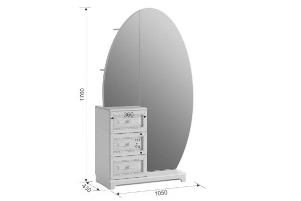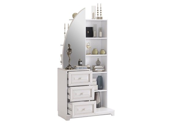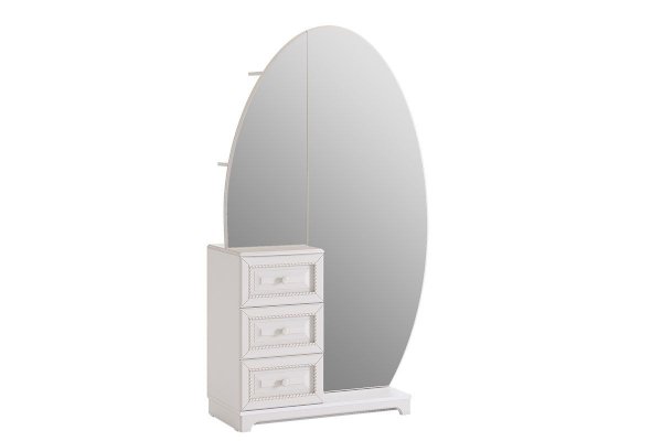 Шкаф совмещает в себе как функционал трюмо, так и вместительного шкафа. Множество скрытых зеркалом полок позволит хранить в нем максимальное количество вещей и аксессуаров. Столешницу из МДФ украшает фрезеровка. На фасады выдвижных ящиков нанесен фрезерованный рисунок. Дверца с зеркалом оснащена доводчиками, благодаря которым закрывается бесшумно.