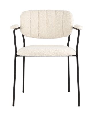 Современный обеденный стул с подлокотниками и металлическими ножками. Обивка выполнена из мягкой и легкой ткани букле. Красивый и очень мягкий материал, который оставляет ощущение теплоты и уюта. Металлический каркас черного цвета огибает спинку и плавно переходит из подлокотников в ножки. Широкое сиденье обеспечивает удобную посадку и уют. На подлокотниках для дополнительного комфорта предусмотрены мягкие накладки.