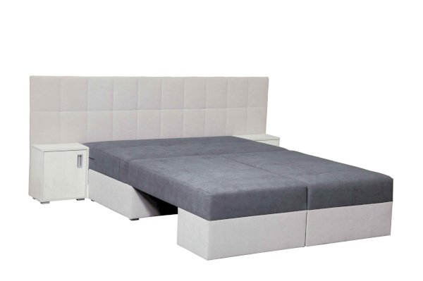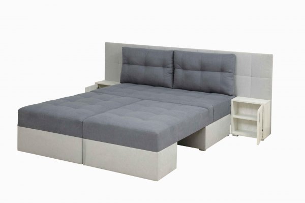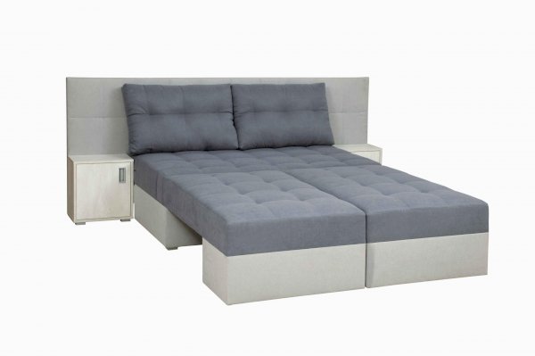 Даллас совмещает функционал кровати, прикроватных тумб и практичность дивана в одной модели. Стильно, практично, функционально и просто необычно! Половинки дивана соединяются к середине при помощи механизма трансформации «ножницы», легко фиксируясь между собой, образуют полноценное место двуспальной кровати 2000х1500 с пружинным матрасом, с декорированной утяжками мягкой прикроватной спинкой и двумя открывающимися тумбами, ручки открывания тумбочек оформлены в цвете матовый хром.