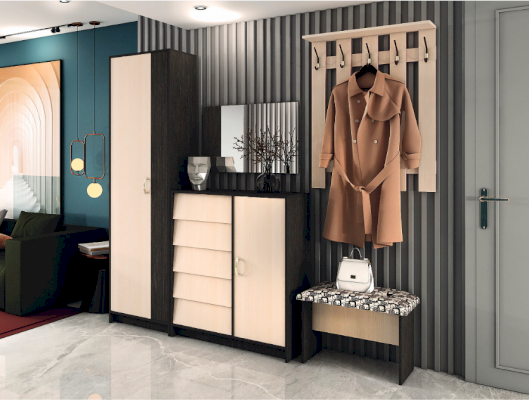 Интро - это целая серия мебели, с помощью которой вы можете обустроить прихожую. В серии представлены обувницы разных размеров с откидными створками, шкаф, зеркало, вешалки.