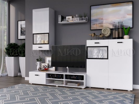 Глянцевая гостиная «Рио» впишется в пространство любой комнаты и любого стиля. Модный блеск фасадов зрительно делает комнату просторнее и светлее. Подобная мебель отличается оригинальным модулями, позволяющими красиво расставить мебель.