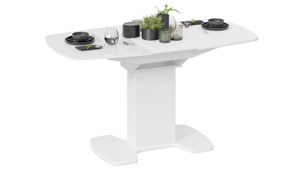 Модель обладает высокой функциональностью – за счет внутренней вставки «бабочка», конструкция позволяет из компактных размеров сделать вместительный обеденный стол. Благодаря использованию направляющих синхронного раздвижения, регулировка размеров столешницы осуществляется плавно и без усилий.