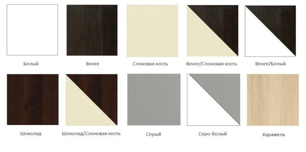 Возможные цвета кроваток: белый, слоновая кость, венге, венге/слоновая кость, венге/белый, шоколад, шоколад/слоновая кость, серый, серо-белый, карамель
