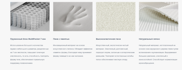 Наполнение из кокосовой койры и современного гипоаллергенного материала Foam в комбинации с блоком независимых пружин MultiPocket, имеющий 7 зон различной степени упругости плотностью 1 000 пружин на спальное место, передают ощущение комфорта и обеспечивают качественный отдых вне зависимости от индивидуальных особенностей.