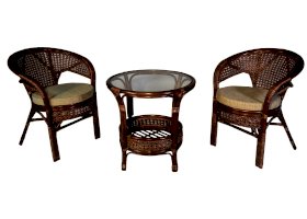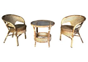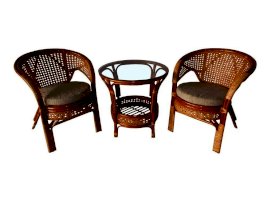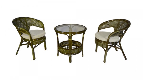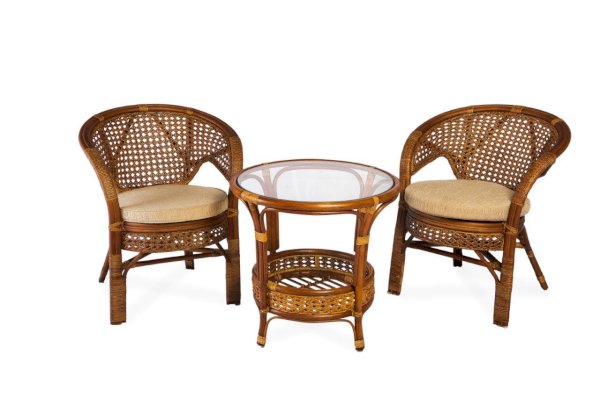 Комплект мебели Пеланги 02/15 включает в себя: 2 кресла и столик с красивым плетением снизу и полочкой, съемные подушки из материала улучшенного качества.
