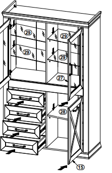 Верхняя часть конструкции – отделение со стеклянными полками, закрывающееся частично застекленными распашными дверцами.