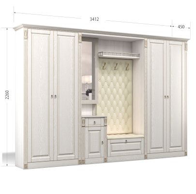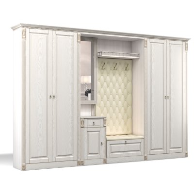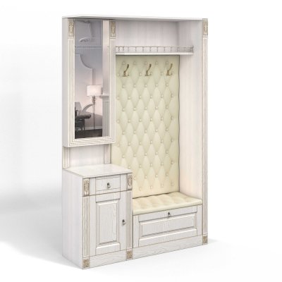 Прихожая выполнена в классическом стиле с декоративными элементами. Фасады и декоративные элементы патинированы, патина наносится вручную, по классической итальянской технологии и защищена матовым лаком. Мягкие элементы (вешалка и сиденье) выполнены из экокожи, декорированы каретной стяжкой.