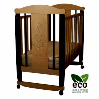 Кроватка декорирована фрезерным рисунком "Собака в чашке". Уникальные фрезерные рисунки размером от 50 см на обеих спинках.