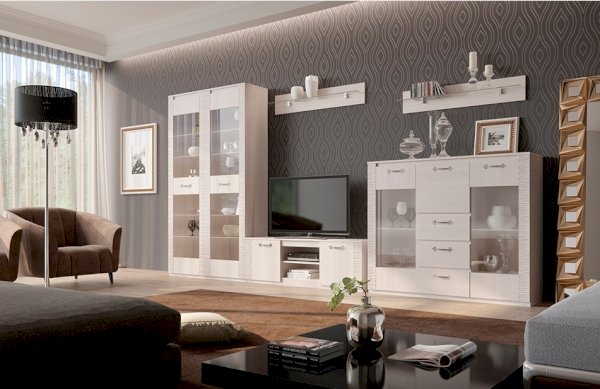 Гостиная «Элана» обязательно покорит любителей минимализма и сторонников практичности, ведь она может комплектоваться по Вашему желанию различными шкафами достаточной вместимости и полками, на которых удобно разместятся и важные мелочи, и элементы декора. Располагаться элементы гостиной «Элана» могут различным образом, что придаст помещению, в котором она будет находиться, неповторимый вид. Дополнительно к основным модулям гостиной «Элана» рекомендуется приобрести полку «Лаго», один из вариантов журнальных столиков, а также добавить романтики в обычный вечер с помощью специальной светодиодной подсветки, которая может быть расположена в стеклянных полках.