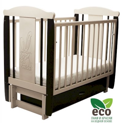 Кроватка декорирована фрезерным рисунком "Заяц с бантом". Уникальные фрезерные рисунки размером от 50 см на обеих спинках.