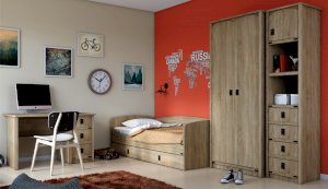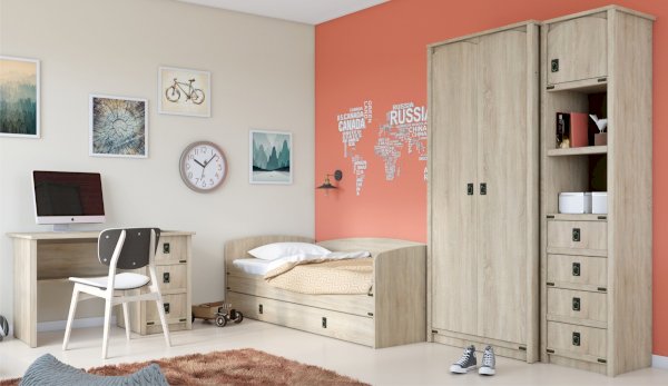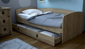 Кровать-тахта – со скругленным изголовьем и высокой спинкой имеет дополнительное спальное место, с помощью множества роликов его легко выдвинуть, можно использовать как ящик для белья. Мягкая кромка 2мм защищает края кровати от повреждений и сколов. Украшением служат стилизованные металлические ручки MARINE бронзового цвета и декоративные элементы в тон. В комплекте с декоративным матрасом и подушками превращается в молодежный диван. Пользоваться кроватью может взрослый и ребенок любого возраста, так как она имеет размеры стандартной кровати 90х200см, устойчивую конструкцию и нейтральный для интерьера цвет. Идеально компонуется со всеми модулями системы Валенсия.