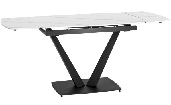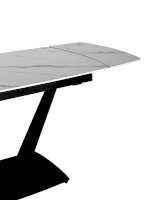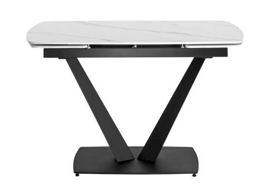 Лаконичный обеденный стол Клео с рисунком белого мрамора. Столешница из керамики отличный вариант для кухни. Материал знаменит прочностью и долговечностью, поверхность устойчива к различным внешним воздействиям. Компактный размер позволяет экономить пространство. Благодаря спрятанным по бокам элементам можно увеличить полезную площадь стола до 30 или 60 см. Металлический каркас черного цвета гармонично сочетается с цветом столешницы. Ножки V-формы надежно удерживают всю конструкцию. Основание каркаса оснащено заглушками, которые не позволяют металлическим частям соприкасаться с полом и портить покрытие при перемещении.