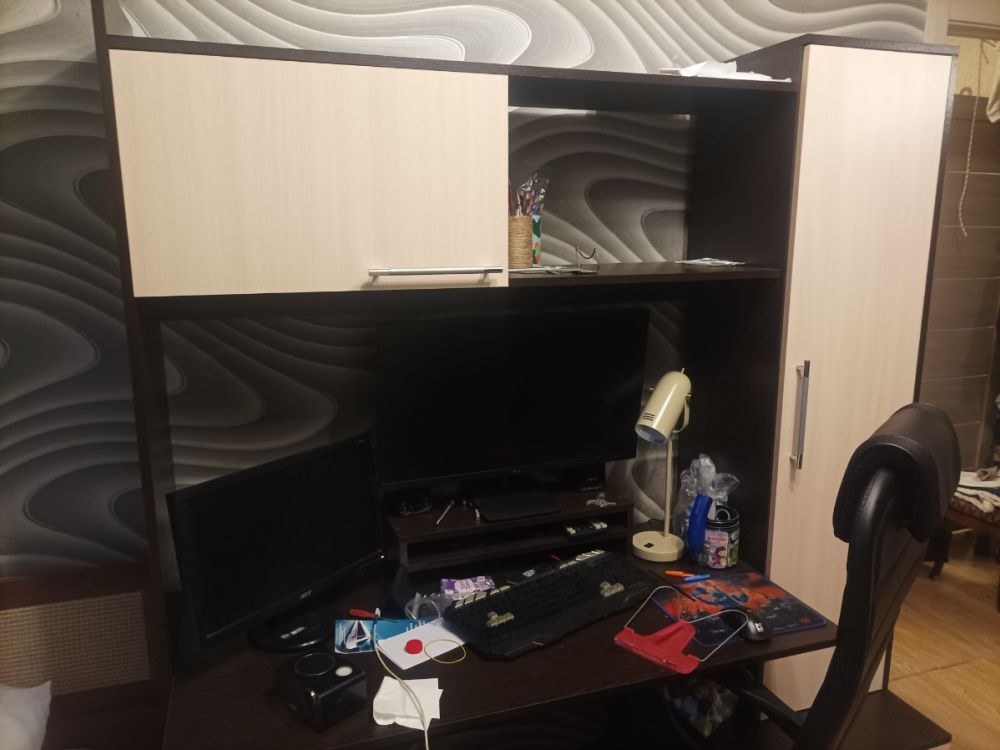 В общем покупкой доволен по сравнению со старым угловым столом более компактный, столешница прям целоее рабочее место можно использовать под верстачек или парту для школьника, пришлось засверлить отверстие под кабеля чтоб не пускать их за стеной, доработаю край столешницы слишком острый угол, по сборке где то часа 3 ушло но без метра никуда, в комплекте есть все и даже подробная инструеция со всеми размерами деталей, короче отличный стол - шкаф!!!! И еще остается место небольгое за нижней перегородкой испольщую чтобы спрятать стабилизатор от детей...