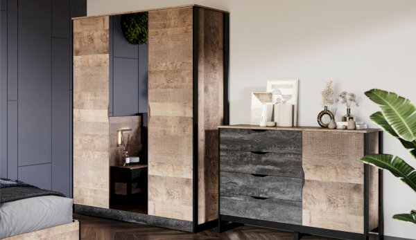 Спальня «Стокгольм» – это современная функциональная система, которая станет главным украшением лофтового интерьера. Особенность дизайна – это сочетание реалистичных по цвету и тактильности трендовых декоров, которые соответствуют последним городским тенденциям. «Дуб Гранж» привлекает имитацией вручную обработанного дерева с выразительной зернистой текстурой, характерной формой досок. Стильный серый цвет «Железного камня» с металлическими разводами и новая текстура состаренной штукатурки в сочетании с гладкостью металла вносят индустриальныи? колорит. Оригинальные ножки-опоры из контрастного профиля МДФ, расположенные по бокам модулей, имитируют металл и подчеркивают стиль коллекции. Кровать выполнена в простых и лаконичных формах, мягкая накладка с вертикальной прострочкой комфортно поддерживает спину во время отдыха. Скрытые опоры основания придают эффект парения, создают завораживающий футуристический интерьер.