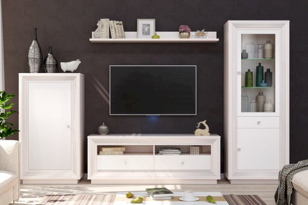 • при покупке мебели в гостиную важна функциональность и универсальность, благодаря наличию стеклодвери, глухого отделения и ящика такая модель может выполнять сразу несколько задач;